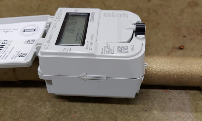 • Mikäli mittarissa on mekaaninen koneisto, on mittarin päällä olevan lähettimen kannen alta nähtävissä musta ratas, joka esittää vesimittarin pyörimistä