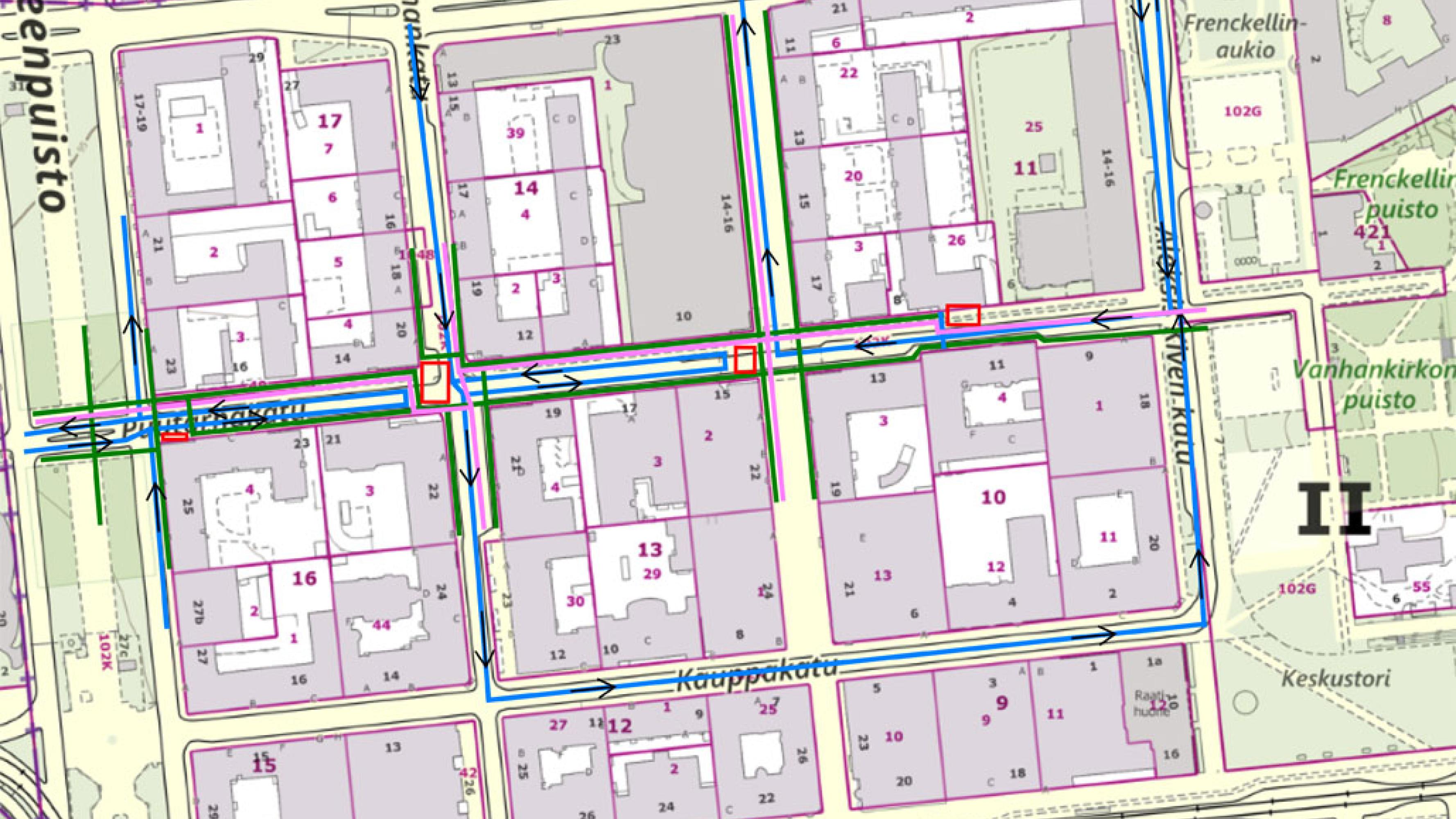 Kuninkaankadun ja Aleksis Kiven kadun välillä töitä tehdään pohjoispuolen kävely- ja pyörätiellä. Kiinteistöille pääsee kulkemaan vähintään ylikulkusilloin. Hämeenpuiston päässä aloitetaan kaapeleiden kaivaminen.