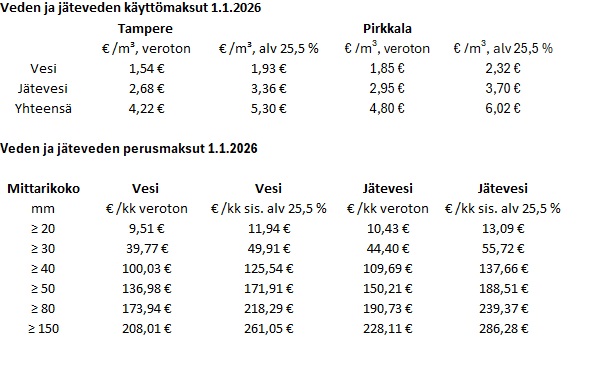 Pirkkalan kunnan ja Tampereen Veden välisen vesihuollon operointisopimuksen mukaisesti Pirkkalassa noudatettavat veden- ja jäteveden käyttömaksut on sidottu Tampereen voimassa oleviin käyttömaksuihin talousveden osalta kertoimella 1,2. Jäteveden osalta kerroin muuttuu 1.1.2026 ja se on 1,1. Veden ja jäteveden perusmaksut ovat samat Tampereella ja Pirkkalassa.