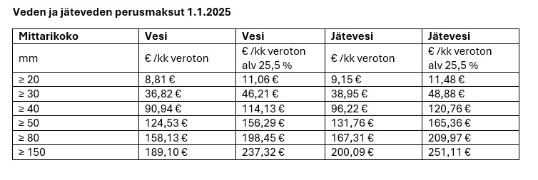Omakoti- ja rivitaloasiakkailla perusmaksut pysyvät ennallaan (vesimittarikoot ≤ 20 mm ja ≤ 30 mm). Muiden asiakkaiden perusmaksut nousevat 14 %. Euromääräinen korotus riippuu asiakkaan mittarikoosta. Talousveden ja jäteveden käyttömaksut nousevat 14 %.